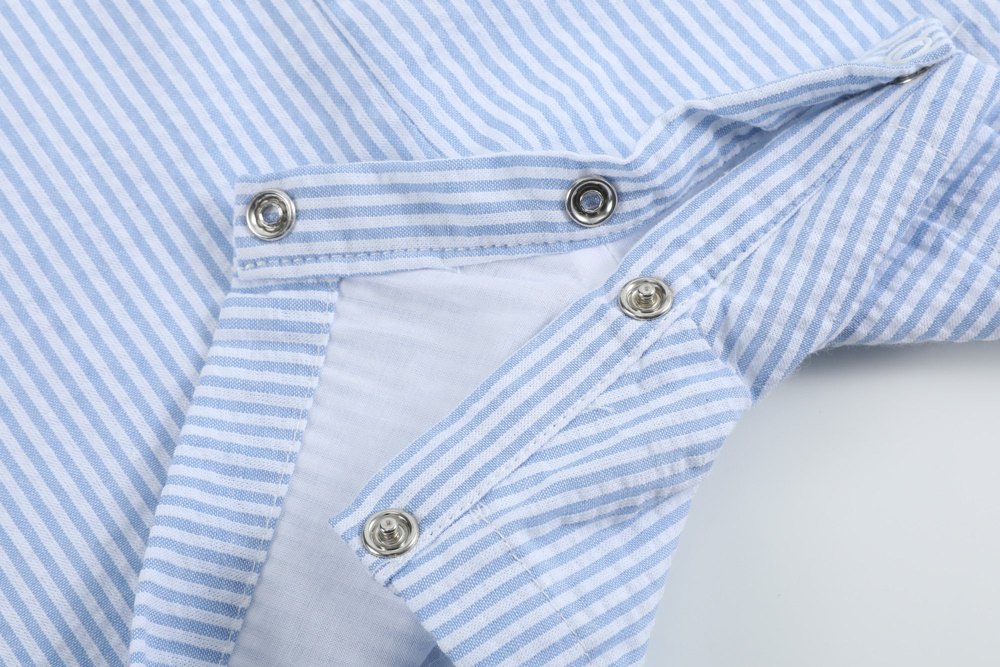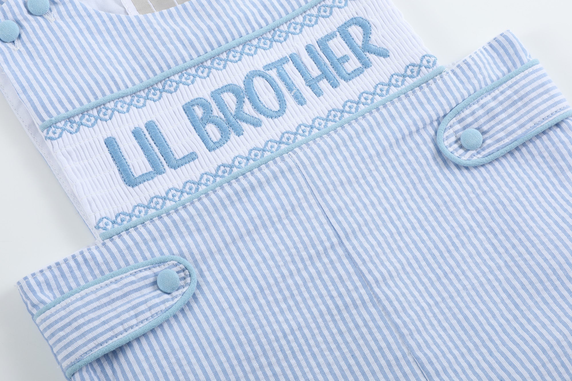 Dress your littlest guy in our Light Blue Seersucker Lil Brother Smocked Jon Jons! Adorable smocked panel with embroidered 'Lil Brother,' coordinating buttons, and sweet blue trim detail. The perfect outfit for the newest addition to your family!