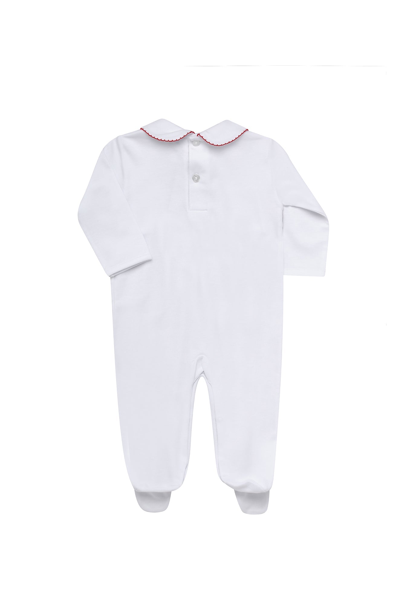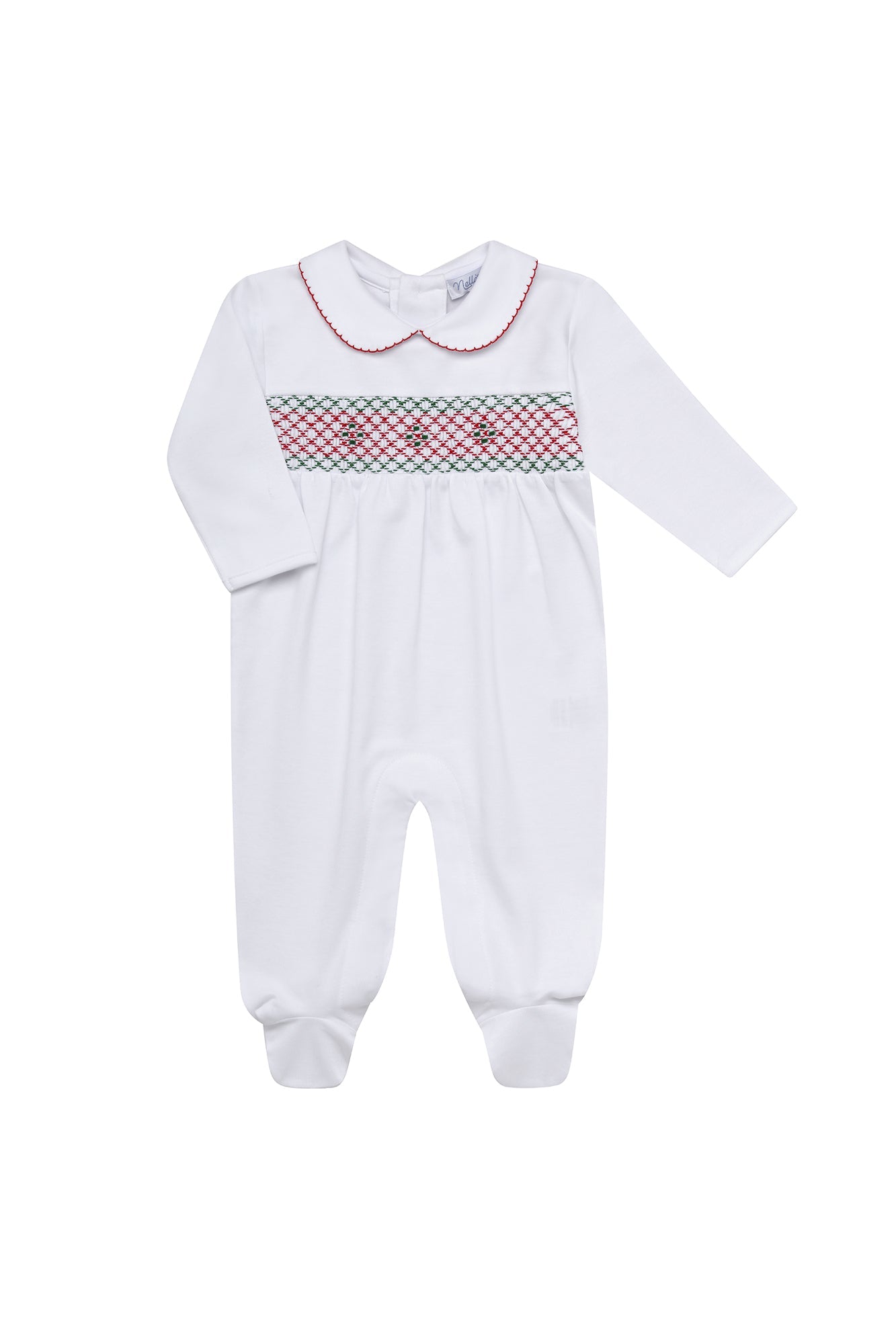 Experience the festive spirit with our White Christmas Smocked Footie! Featuring a charming smocked detail in red and green, this footie captures the magic of the holidays in every stitch. A red picot trim on the neckline adds a touch of timeless sophistication, making it the perfect blend of festive cheer and understated elegance.