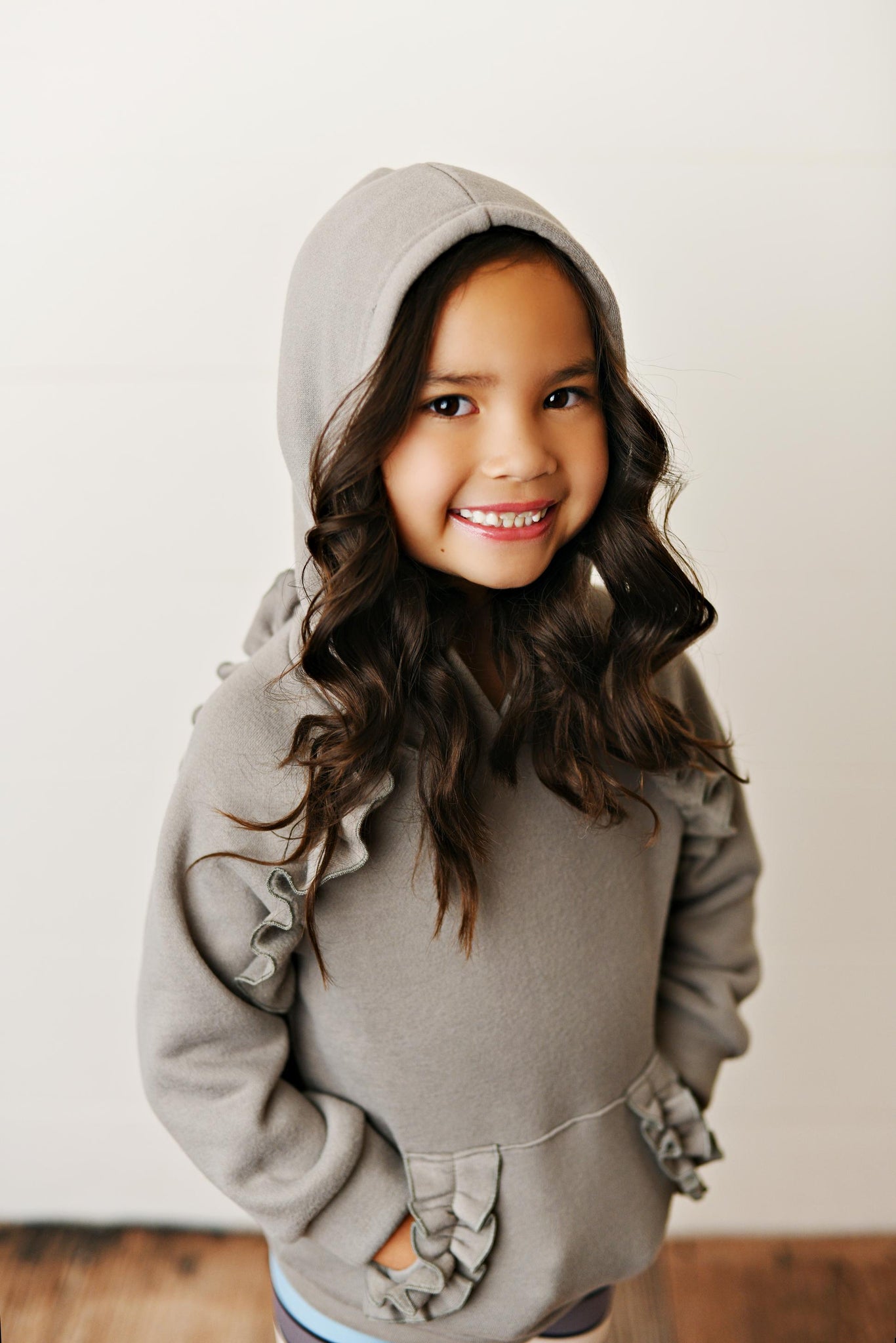 This girls two piece set includes a gray ruffle hooded top with a front ruffle pocket and beautiful rainbow stripe leggings. The Perfect loungewear for snuggly Fall and Winter Days!