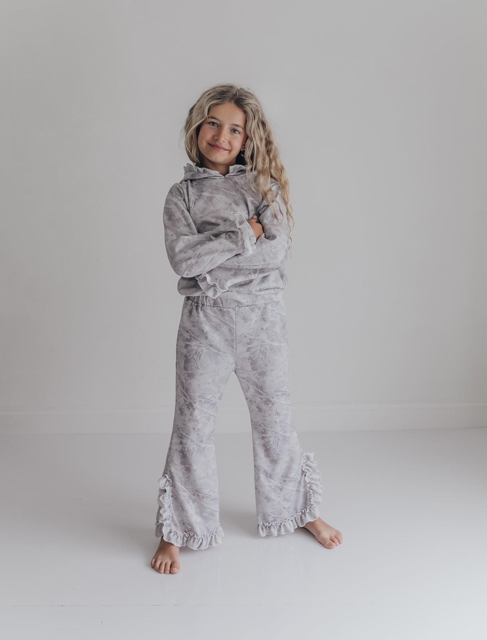 This two-piece hooded set features light gray and white camo print for a on trend look. The flare bottoms and wide sleeves are accented with charming ruffles, while the hood adds cozy comfort. Perfect for lounging in style and embracing a fun, relaxed vibe.