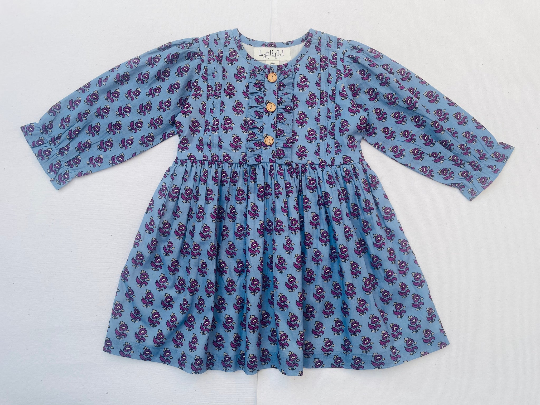 This 100% cotton Long Sleeves Pale Blue Hand Block Printed Dress is the perfect fall dress for your little girl.