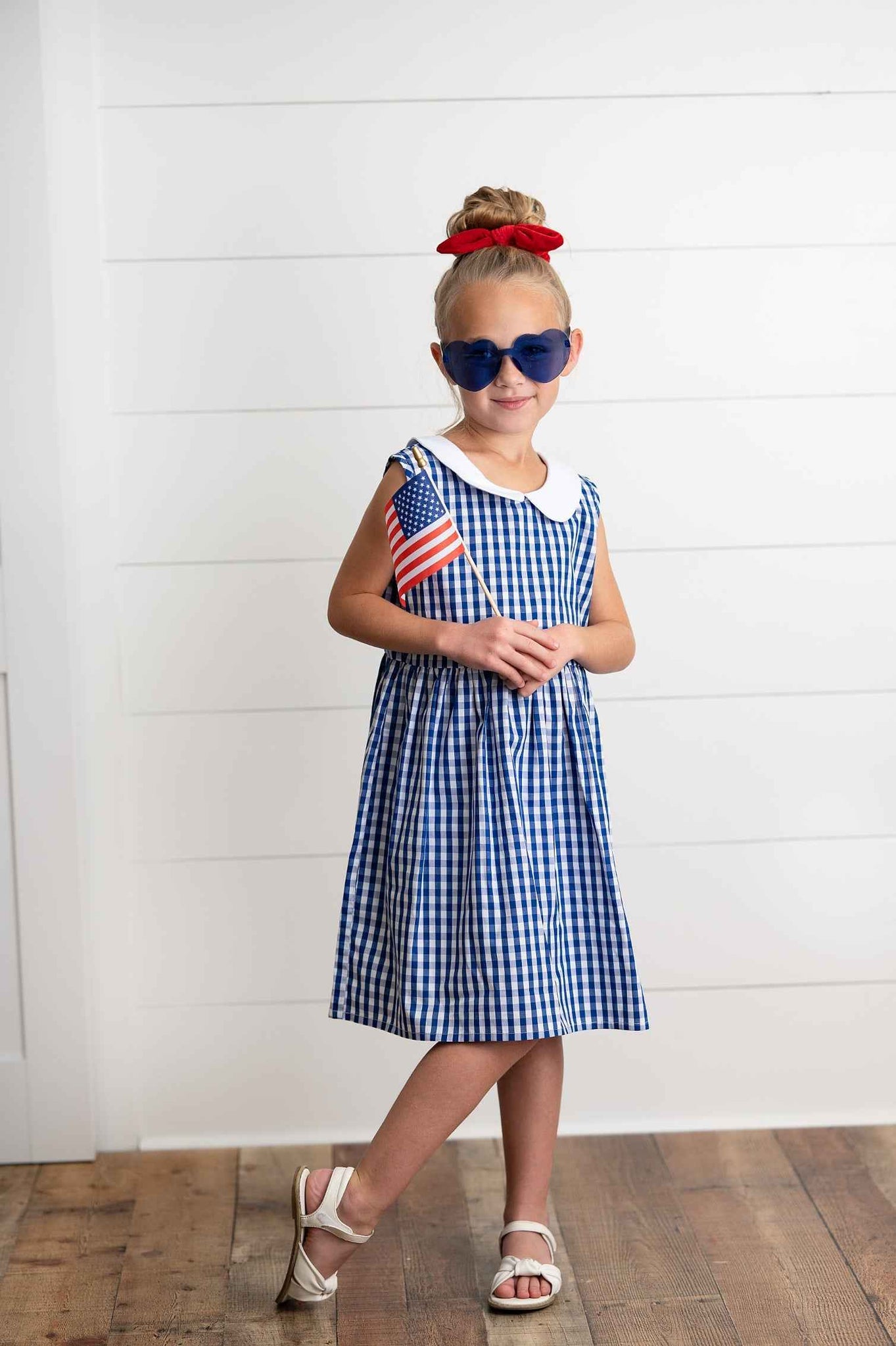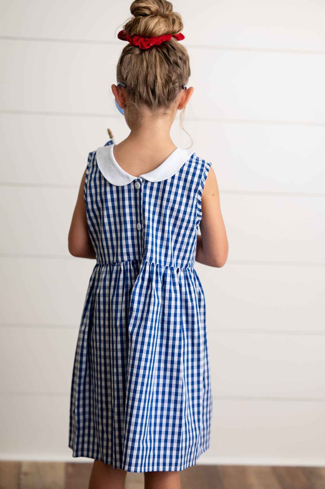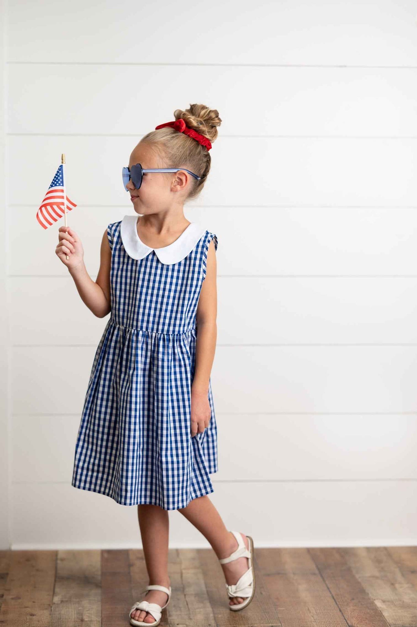 Add some fun to your little girl's summer wardrobe with our navy check dress! Featuring a playful navy and white gingham pattern, this sleeveless sundress is perfect for any summer occasion. With its white peter pan collar and back buttons, it's sure to be a hit for the 4th of July.