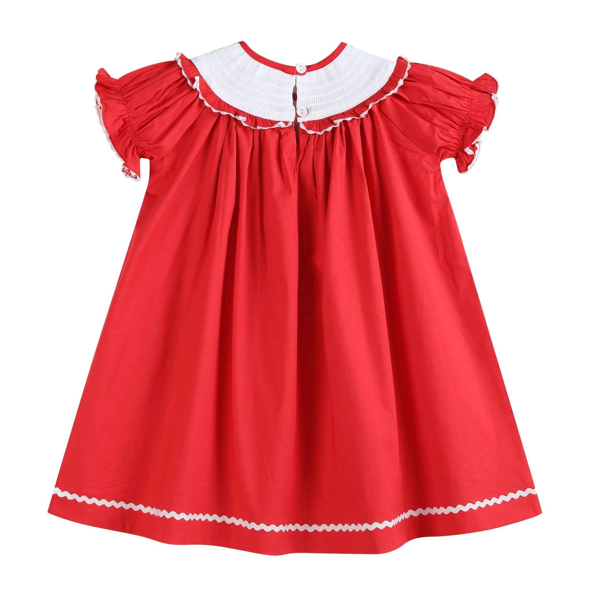 Bring festive cheer to your little one’s holiday wardrobe with the Red Santa Smocked Ruffle Bishop Dress. Made from 100% cotton, this classic bishop-style dress features a smocked neckline with embroidered Santa details, delicate ruffle accents, and subtle trim for a polished look. The traditional calf- to ankle-length silhouette combines comfort and timeless style.