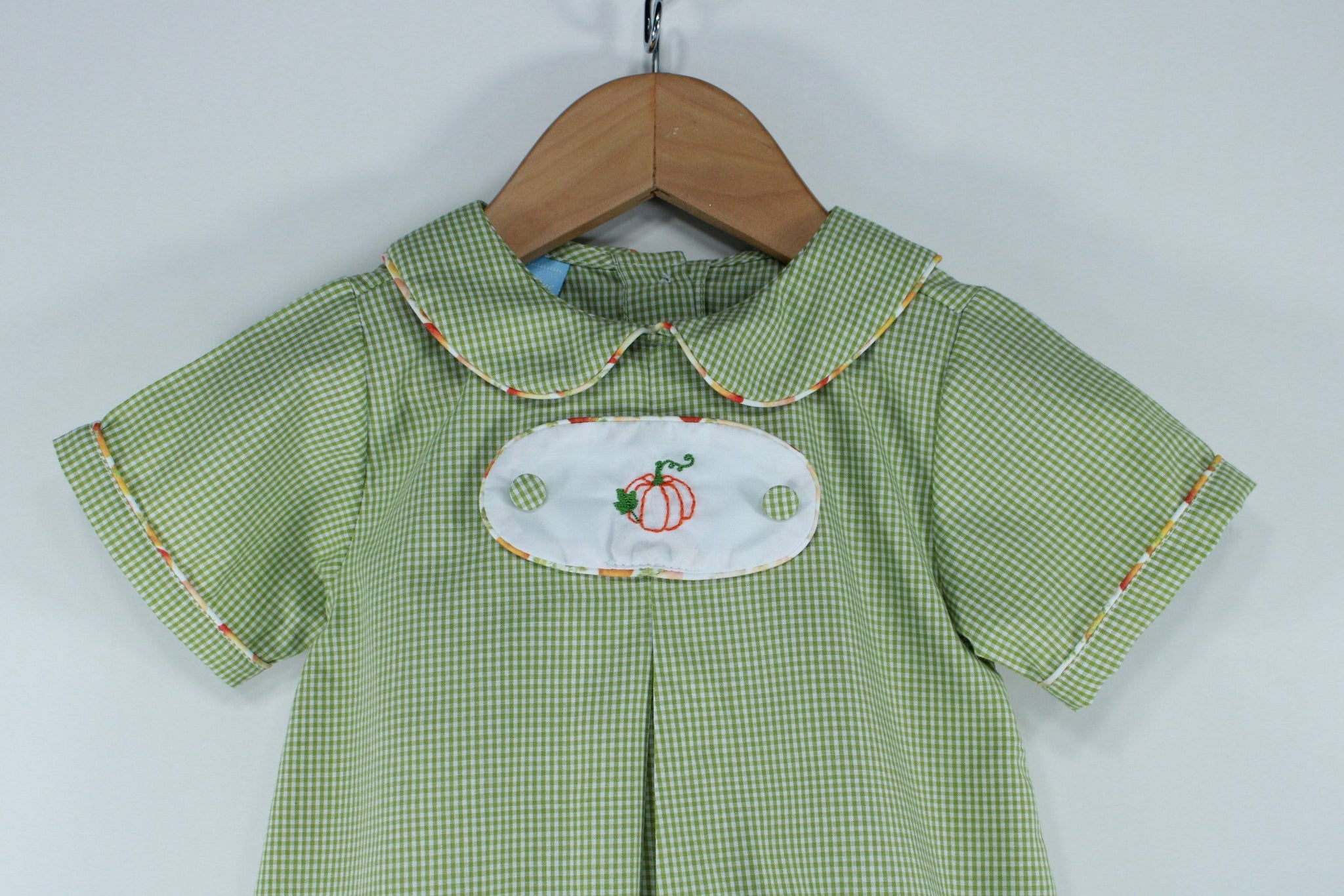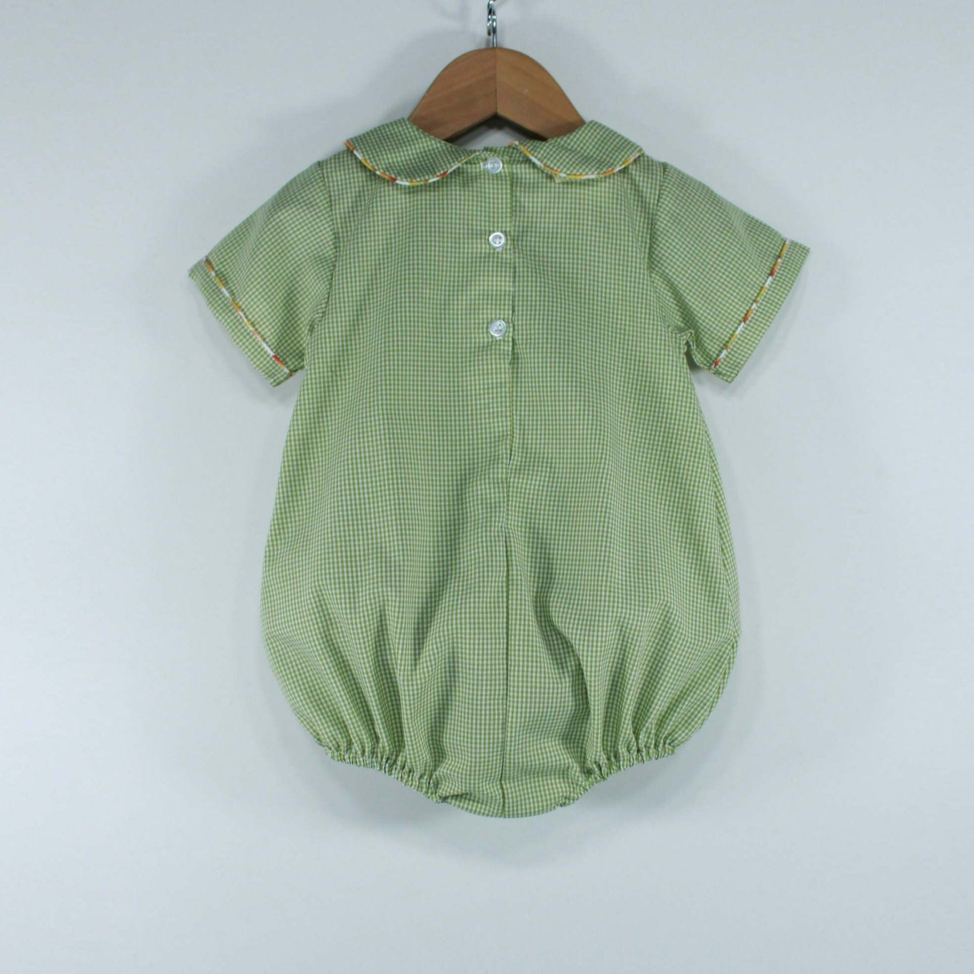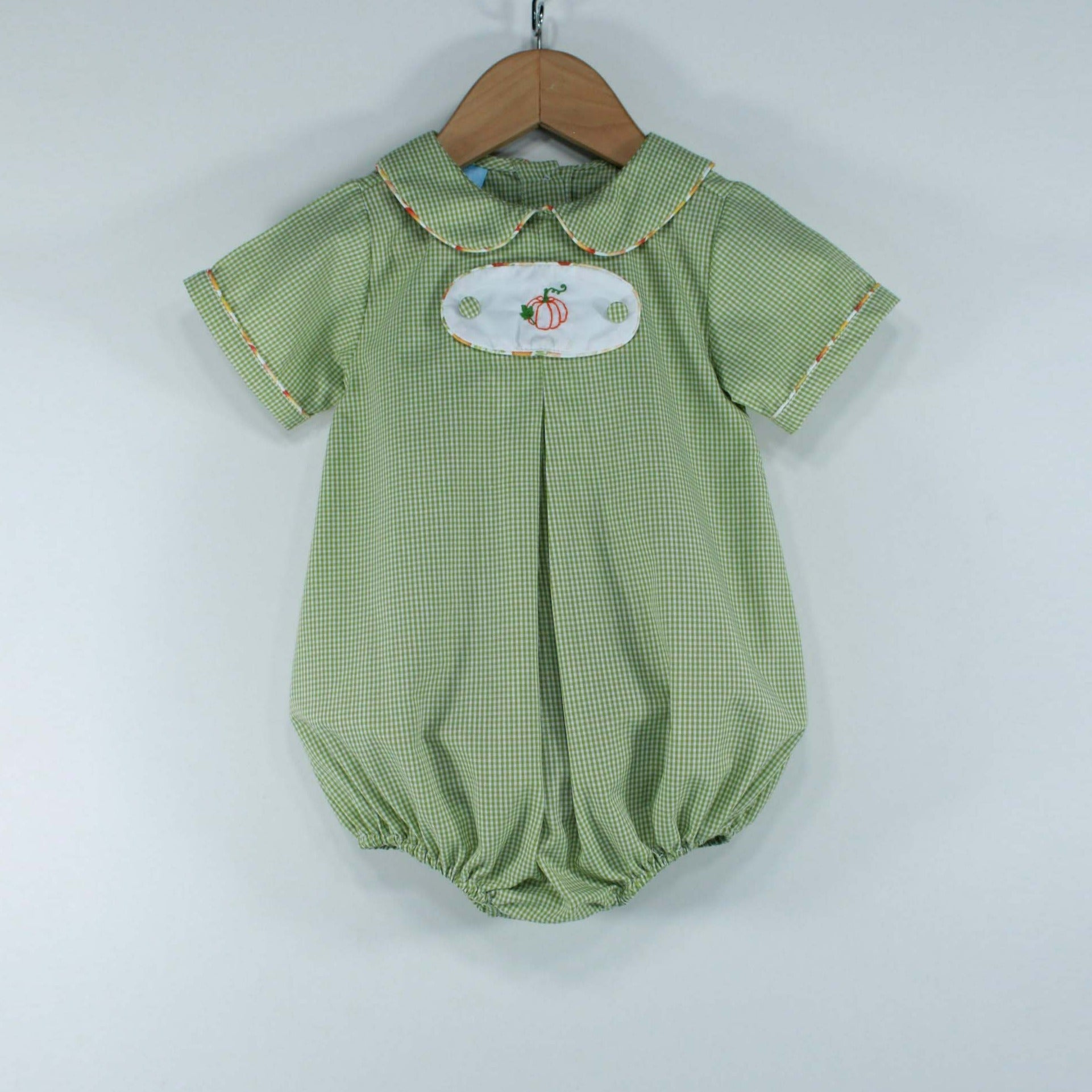 Green gingham baby boy bubble with embroidered pumpkin piece.