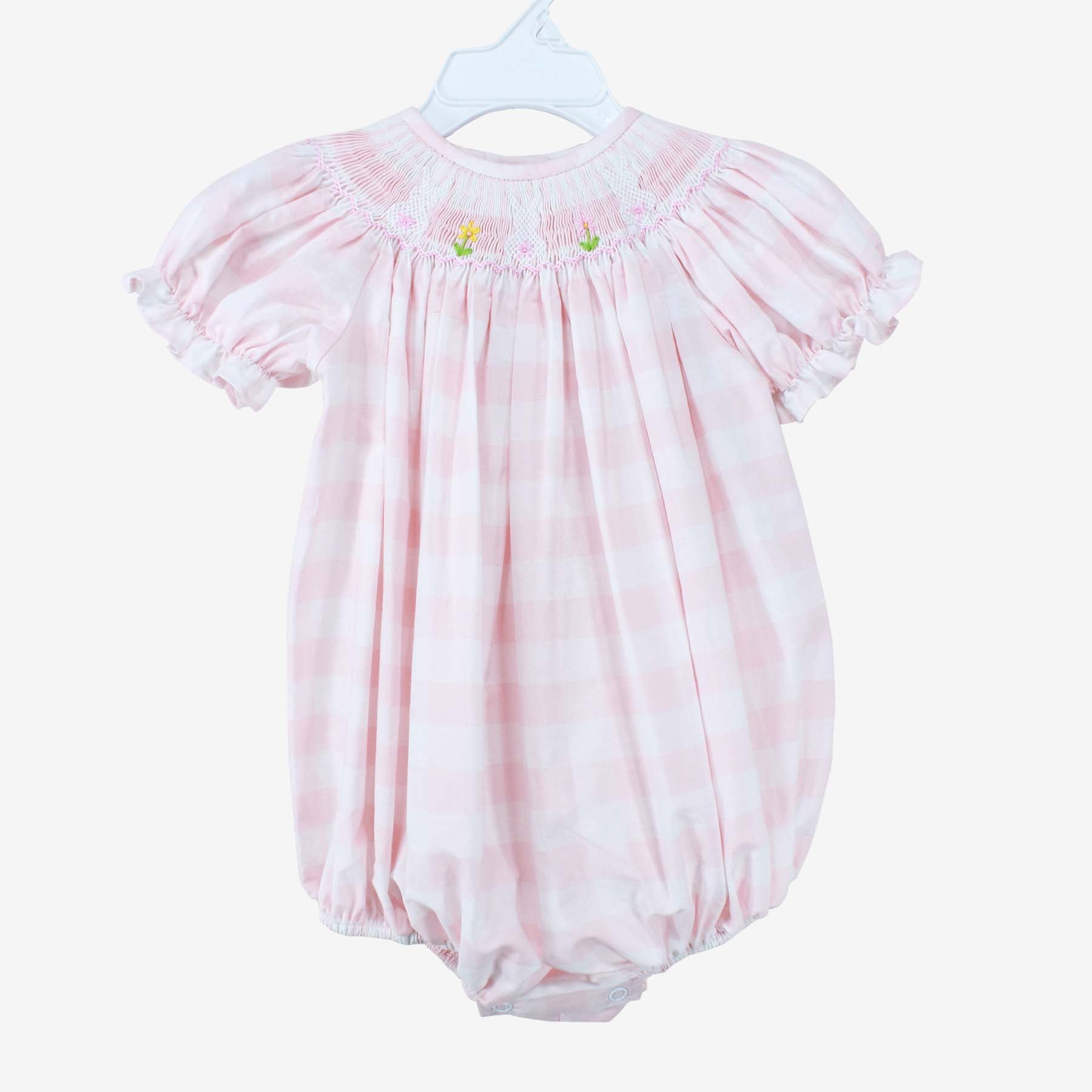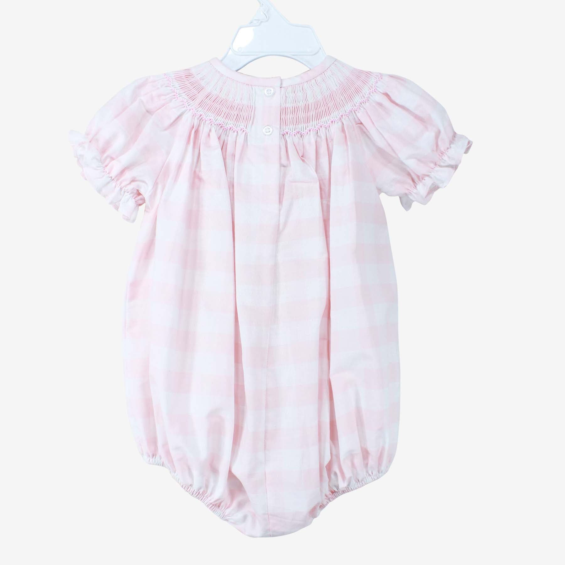 Light pink checkered bishop bubble with bunny and flower embroidery.