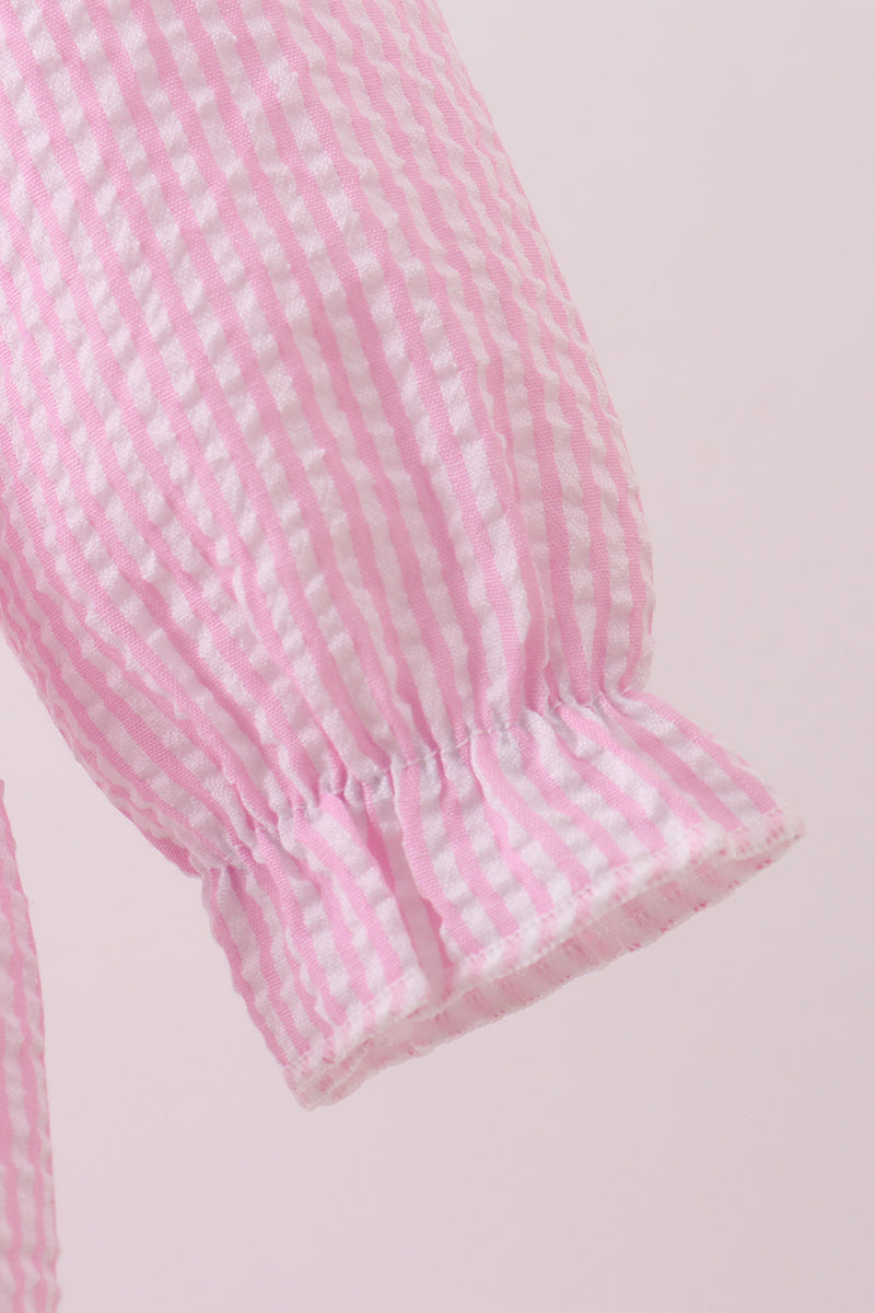 Meet the sweetest addition to any little one's wardrobe! This charming bubble features delightful puppy embroidery set against classic seersucker fabric in soft pink. The playful pup design brings personality and joy, while the textured seersucker keeps things cool and comfortable. Perfect for playdates, family gatherings, or everyday adventures, this bubble combines adorable style with practical comfort. A must-have piece that'll have everyone smiling!