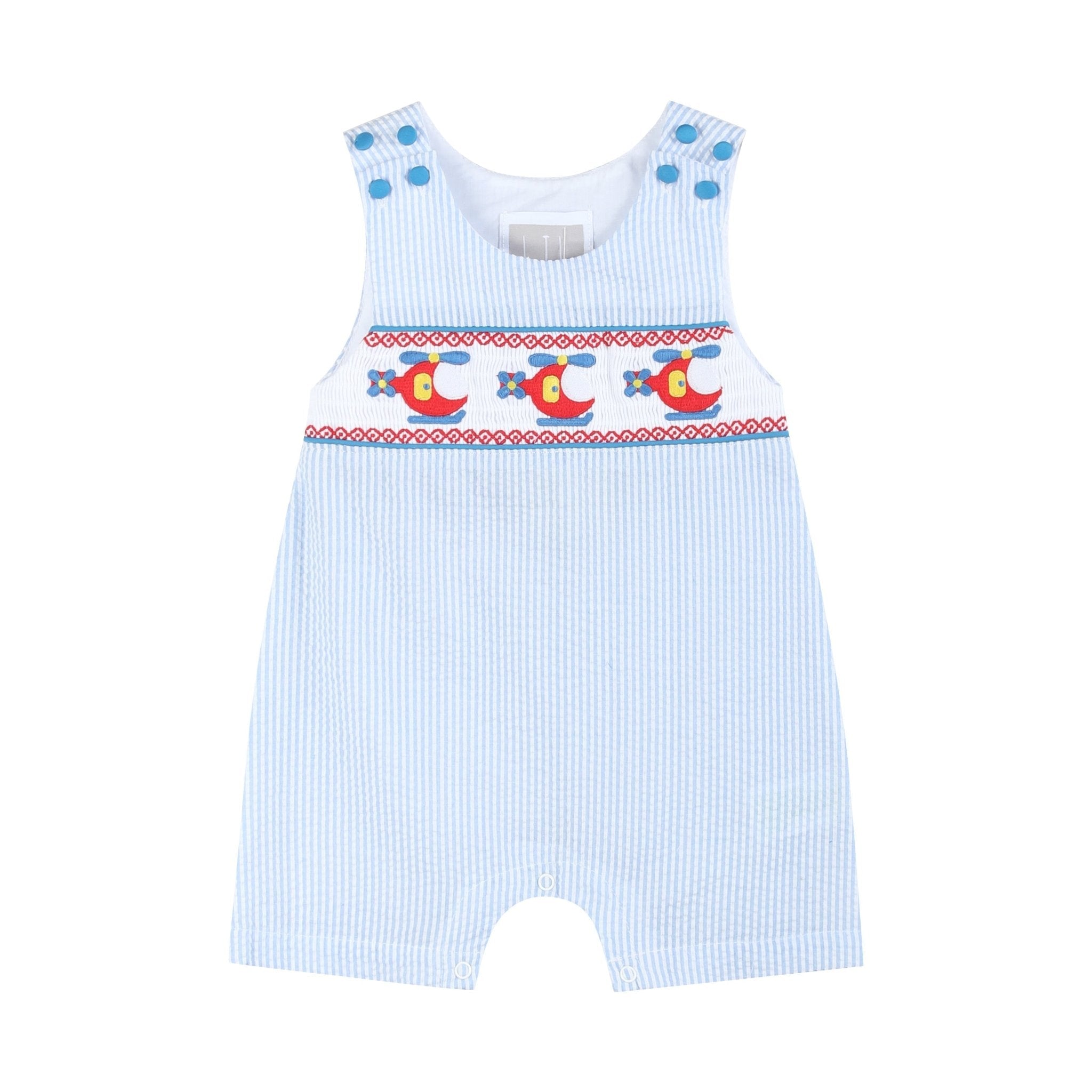 Watch your little one take off in style with these Blue Seersucker Helicopter Smocked Shortalls! Featuring classic smocking across the chest with adorable embroidered helicopters, this outfit is perfect for babies and toddlers who love all things that go. Made from lightweight blue seersucker fabric, it’s breathable and comfortable for warm-weather play. Snaps at the crotch make diaper changes a breeze, and adjustable shoulder buttons offer two size options for growing boys. A fun and timeless choice for little ones ages 3–6M to 2T!