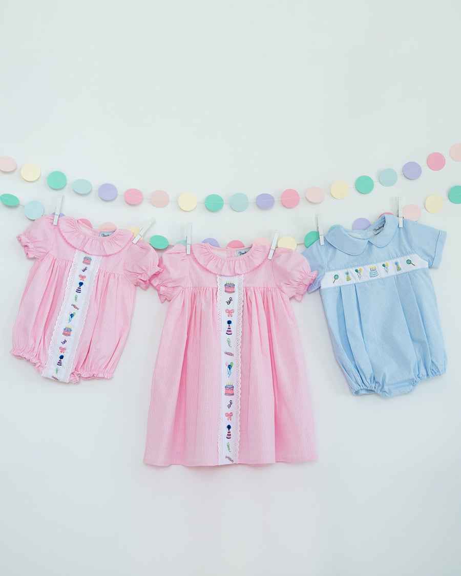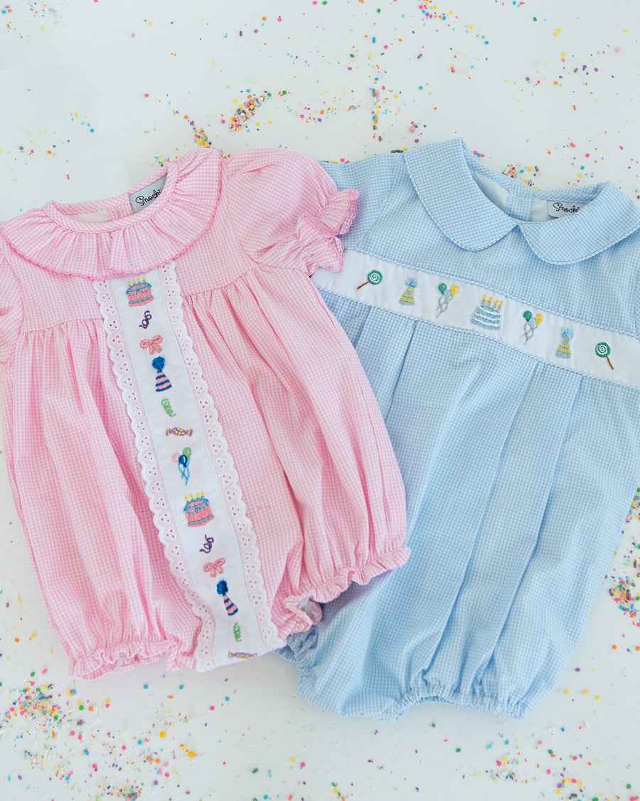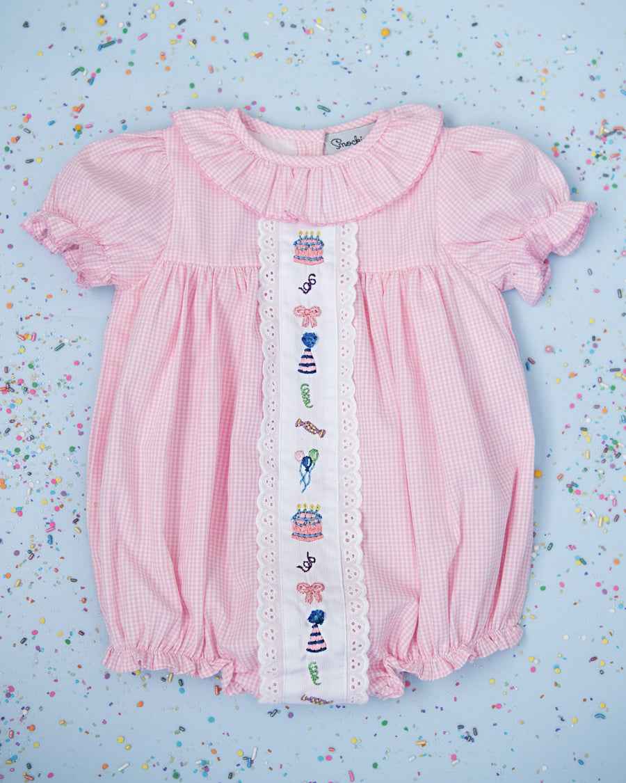 It's birthday party time and this bubble will be stunning on your little one! Cake, candy, party hats, and ribbons are hand embroidered down the center.