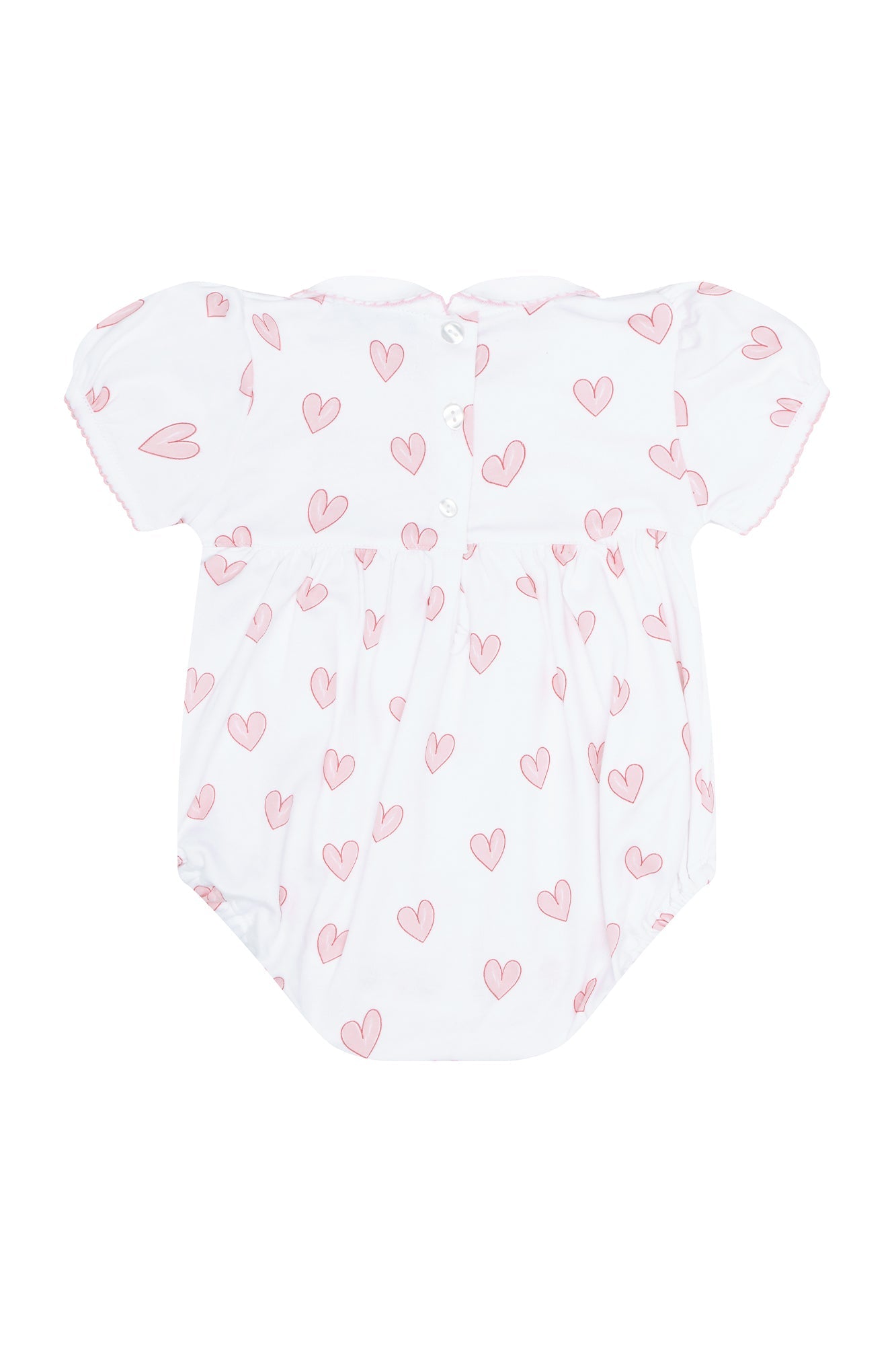 Our 100% Pima Cotton Pink Heart Print Smocked Bubble is designed to bring a touch of sweetness, charm, and friendliness to your baby's wardrobe. Available in sizes ranging from 0 to 18 months, this smocked bubble is crafted with love and care to ensure utmost comfort and irresistible style.