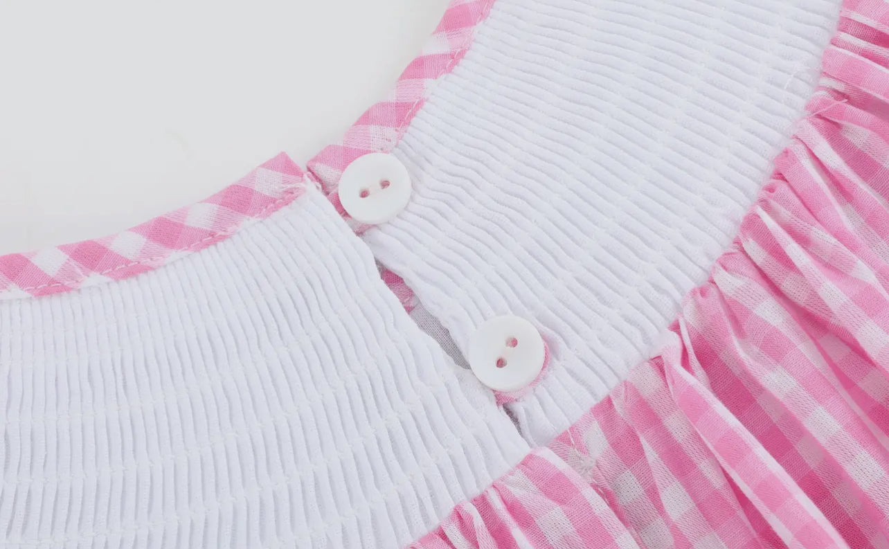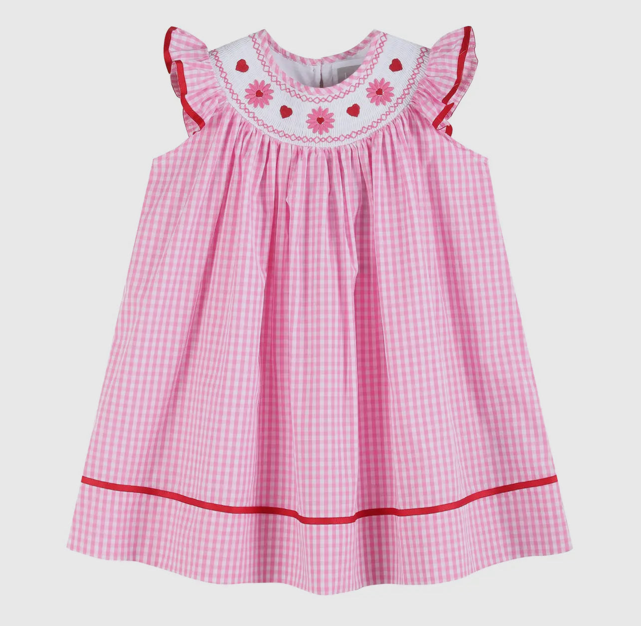 Preorder by 9/30-Pink Gingham Daisy and Hearts Smocked Romper-Ships 12/28