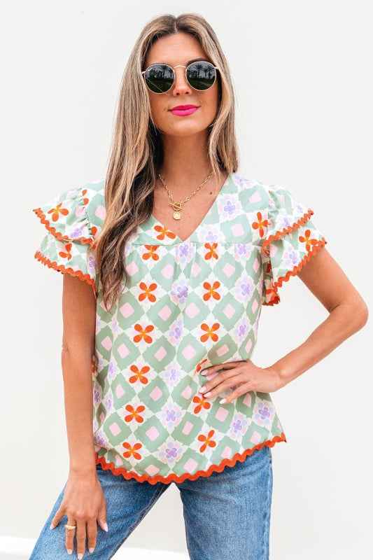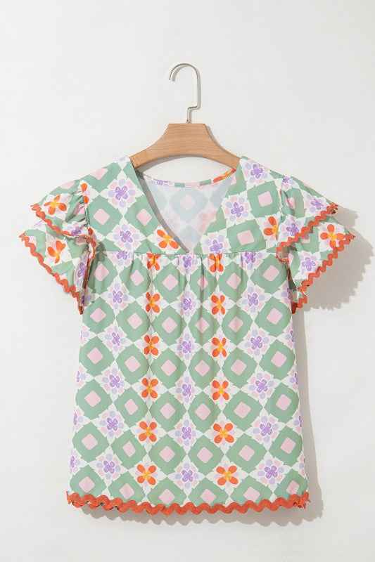 Elevate your wardrobe with this stunning blouse that's impossible to ignore. The eye-catching pattern takes center stage, while layered sleeves add a playful, feminine flair that moves beautifully with you. The flattering neck design is perfect for showcasing your collarbones in style, and delicate ricrac trim detailing brings an extra touch of charm. Whether you're dressing up for a special occasion or adding personality to your everyday look, this blouse delivers both sophistication and fun. 100% Polyester