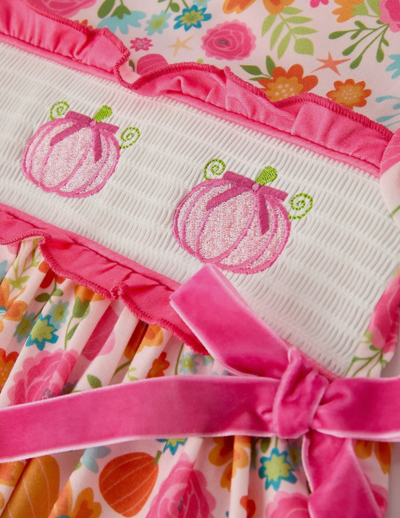 Celebrate the season in style with this Autumn Thanksgiving Pumpkin Embroidery Smock Floral Girls Dress. Featuring charming pumpkin embroidery and delicate floral patterns, it perfectly captures the warmth of fall. The smock design offers comfort and ease of movement, making it ideal for festive gatherings and everyday wear. Dress your little one in this cozy, adorable outfit that blends seasonal charm with playful elegance.