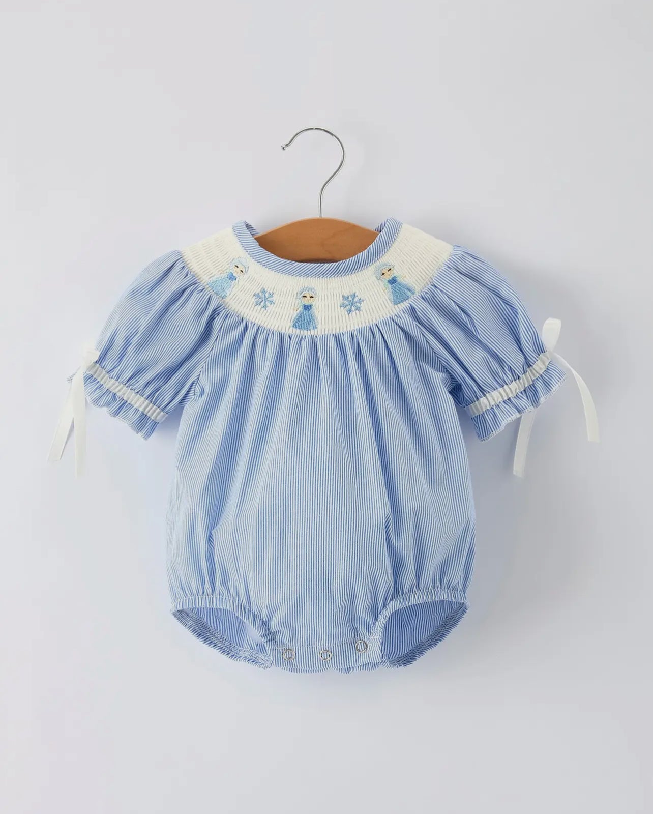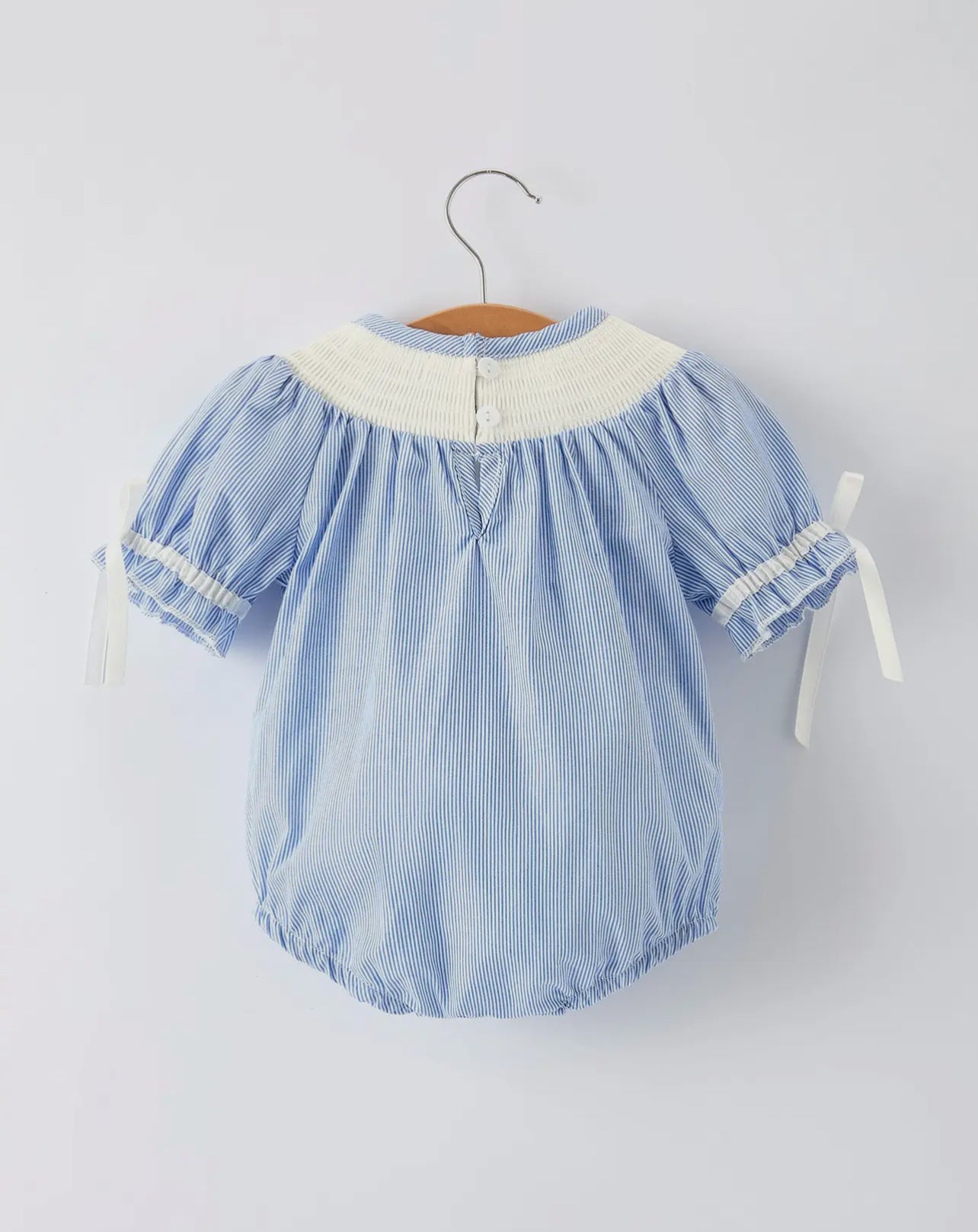 Dress your little one in comfort and charm with this Baby Girls Romper featuring delicate blue stripes and smocked detailing. Crafted with soft, breathable fabric and short sleeves, it keeps your baby cool and cozy all day. The stylish smocking adds a timeless touch, perfect for playdates or special occasions. Easy to wear and gentle on sensitive skin, this romper combines practicality with adorable design.