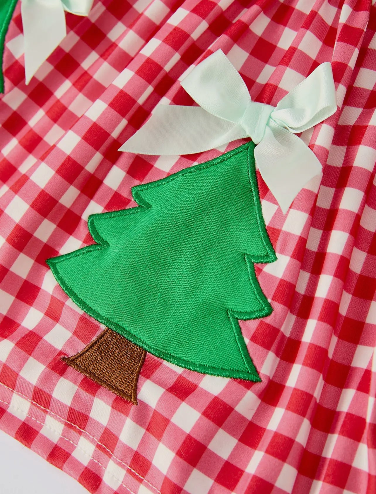 Make holiday dressing effortless and adorable with this Christmas Tree Applique Red Plaid Top paired with Green Bell Bottom Pants set for girls. The festive red plaid top features a charming Christmas tree applique that adds a joyful touch, while the vibrant green bell-bottom pants provide comfortable movement and a playful silhouette.