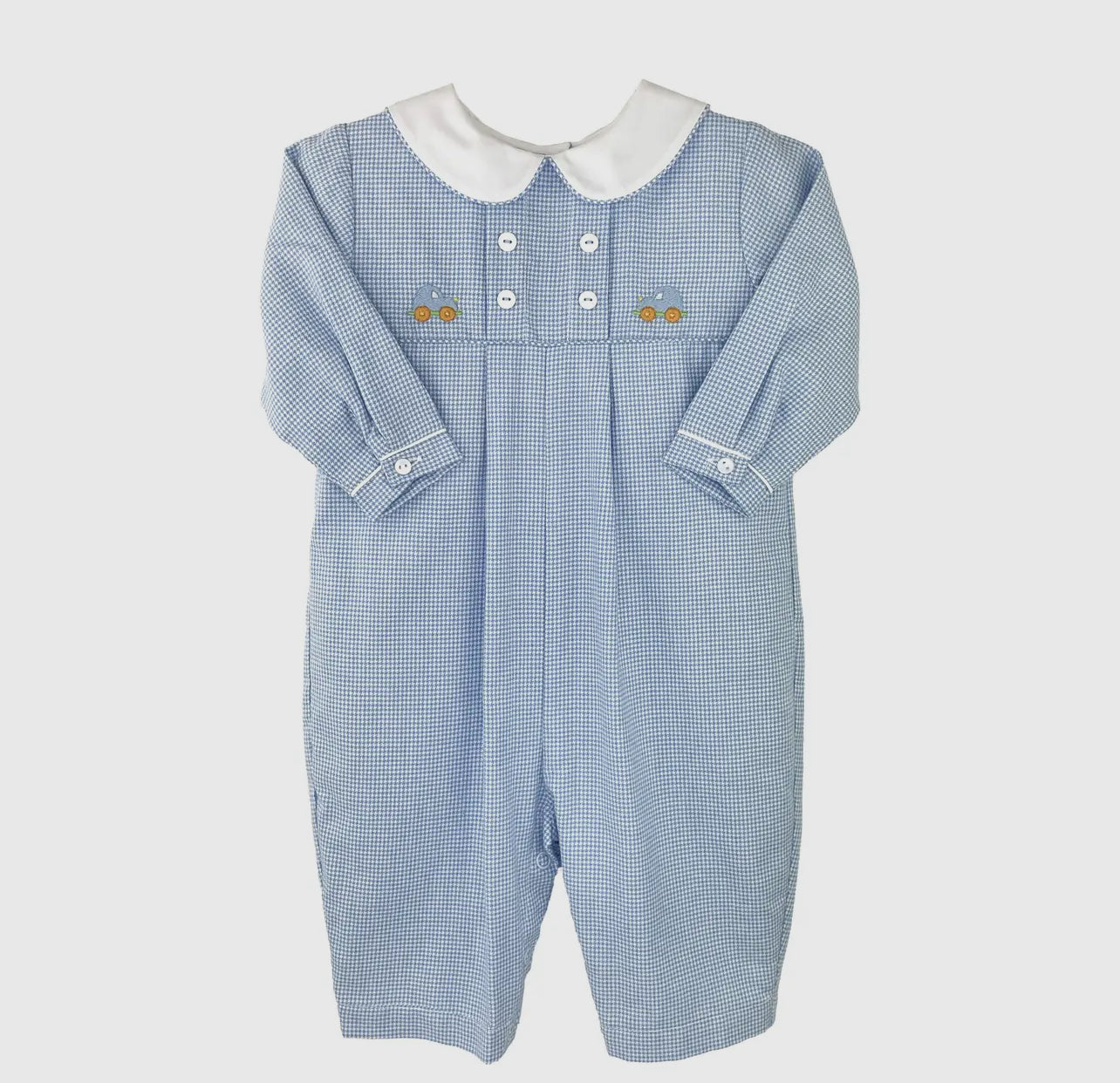 This longall comes in a blue houndstooth print fabric with a front center panel with decorative buttons and embroidered cars. A white peter pan collar with blue trimmed edges adds a little extra detail.