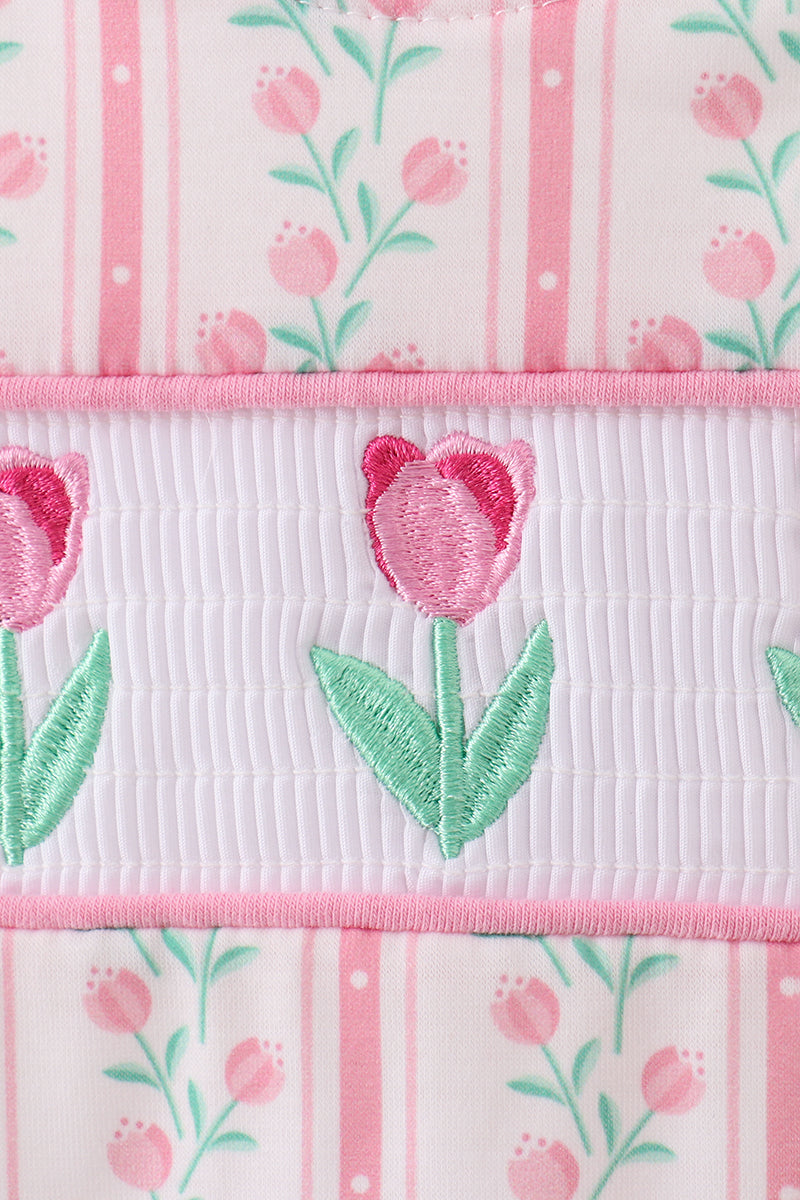 This floral tulip smocked ruffle romper brings a fresh burst of spring fun to any day. Lightweight and comfy, its smocked bodice hugs gently while playful ruffles add a flirty touch. Perfect for sunny adventures or casual outings, this romper blends charm and ease for a lively, spirited look.