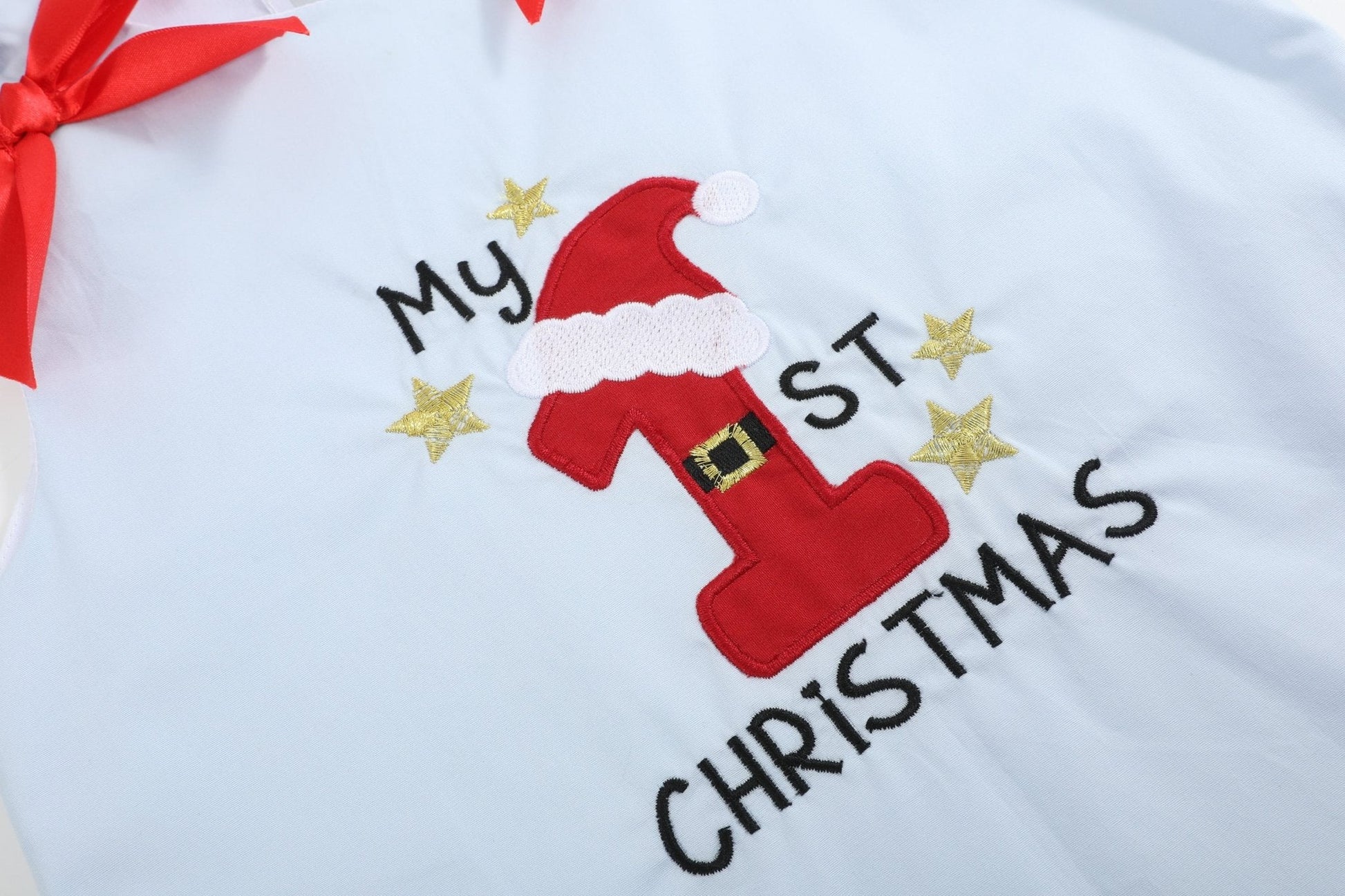 Celebrate your little one’s first Christmas in this adorable My 1st Christmas Jumper Dress. Featuring a charming "1st Christmas" applique on the front, along with two pretty red bows at each shoulder and coordinating buttons for adjustable sizing. Made from soft, breathable light blue cotton, this dress ensures comfort and a festive look. Perfect for creating cherished holiday memories. Available in 6-12M and 12-18M sizes.